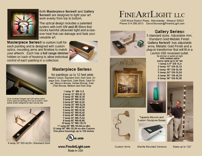 Masterpiece Series® is Fine Art Light's most popular version of our Art Lights and has a built in dimmer, fixed arm and custom color matching of your frame and the housing. It also has any length cord to match your needs and various color of cords. Most Client install a recessed clock outlet behind their painting so no cord will show.